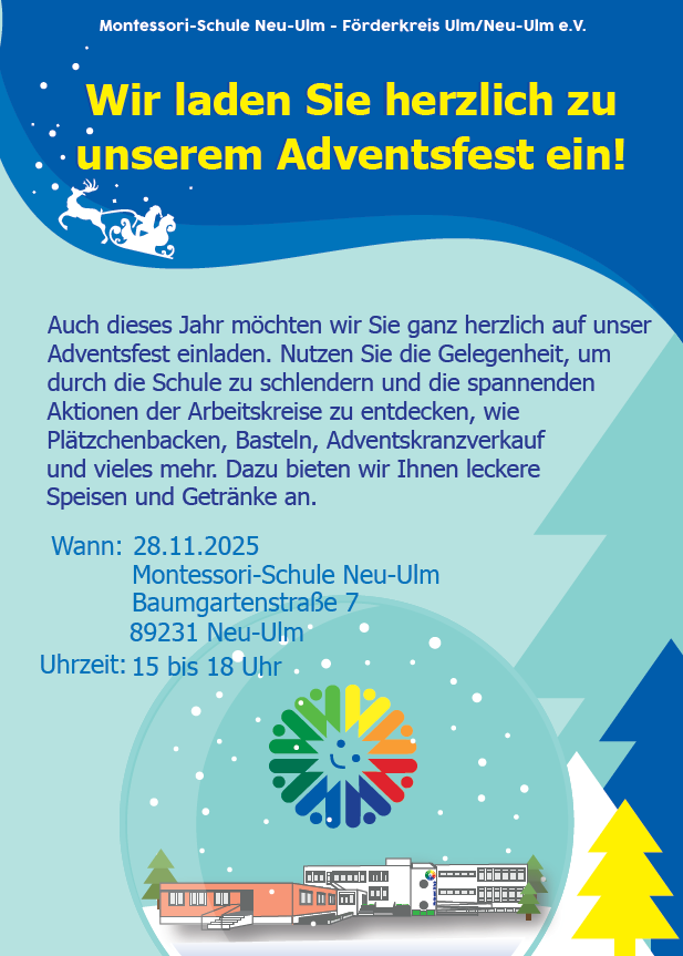 Am Freitag, 28.11.2025 findet von 15.00-18.00 Uhr in der Schule und auf dem Schulgelände wieder unser Adventsfest statt.