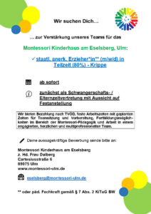 staatl. anerk. Erzieher*in** (m/w/d) in Teilzeit (80%) in der Krippe ab sofort zunächst als Schwangerschafts- / Elternzeit-Vertretung mit Aussicht auf Festanstellung weitere Infos – siehe